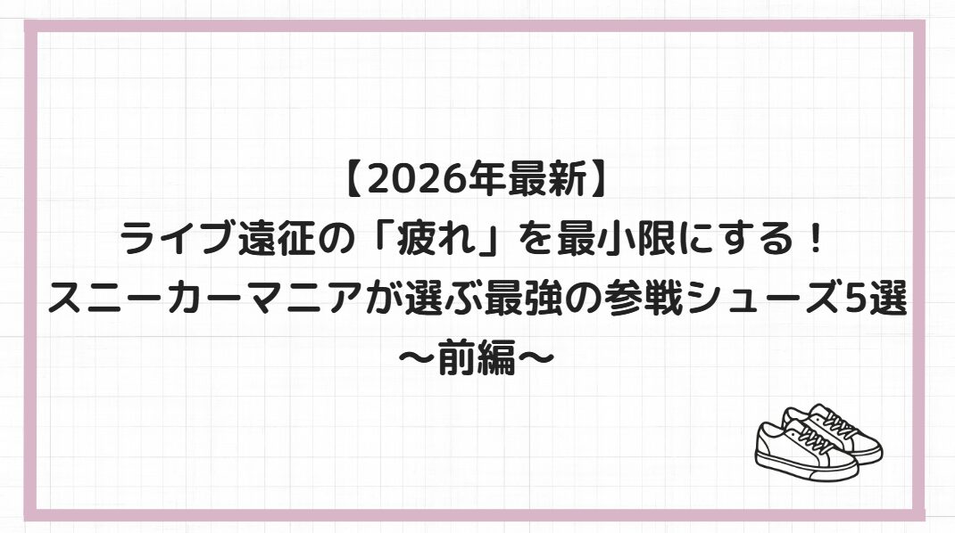 ライブ遠征用スニーカー完全ガイド。スニーカー保有200足超え、スニーカーマニア&コレクターのライターRIMが教える、足が疲れにくい最強モデル5選、ナイキ・アディダス・ニューバランス徹底比較、足のケア術、メンテナンス方法。スタンディング・フェス・遠征シーン別に最適な一足を紹介します。