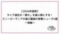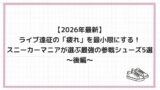 【前半はここまで】 後半では、遠征・移動編の最適スニーカー、ナイキ・アディダス・ニューバランスの徹底比較、ライブ後の足のケア、メンテナンス術を詳しく解説します!